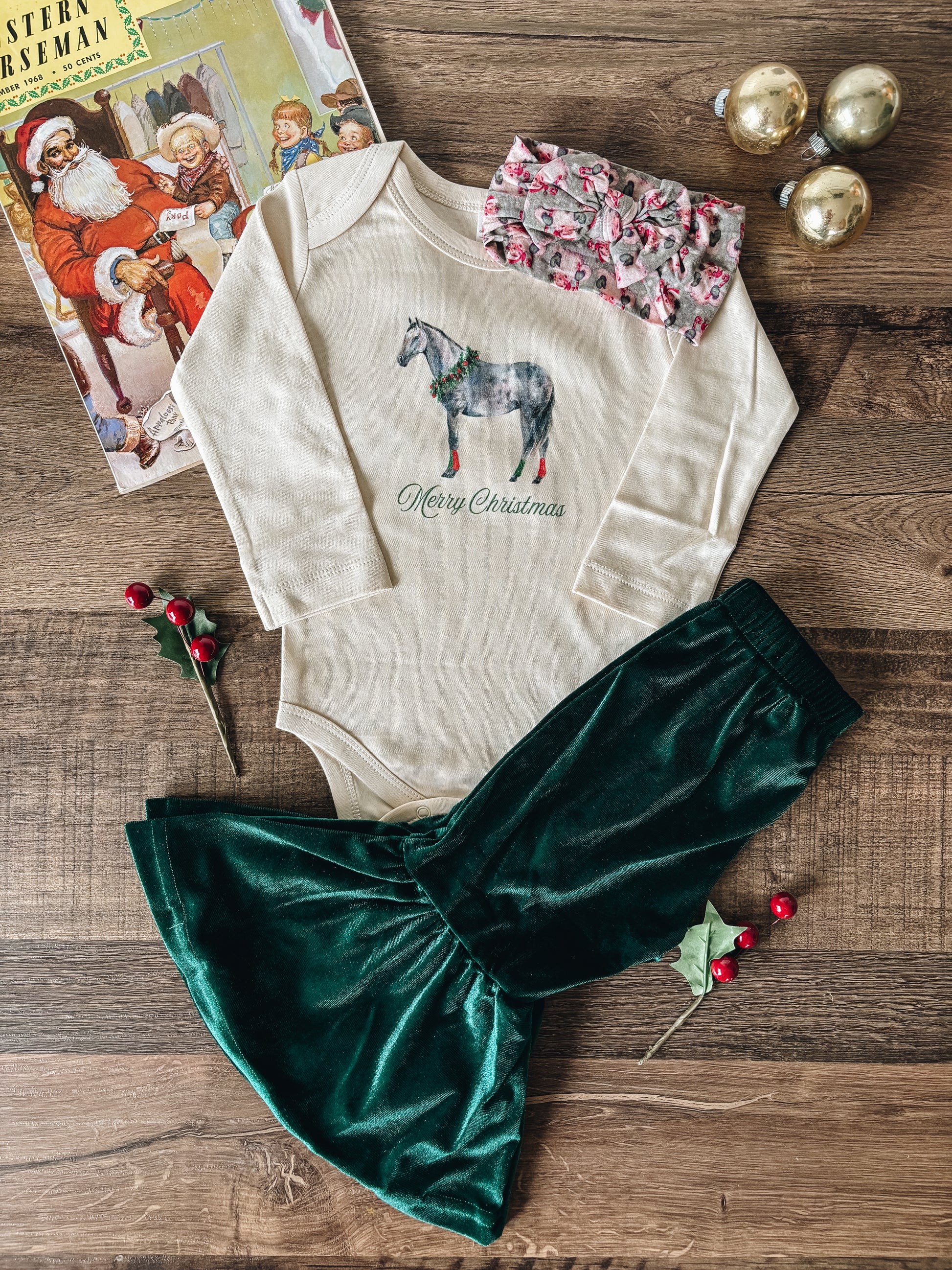 LWB exclusive Merry Christmas Grey Horse design printed on a baby bodysuit and toddler/youth tee