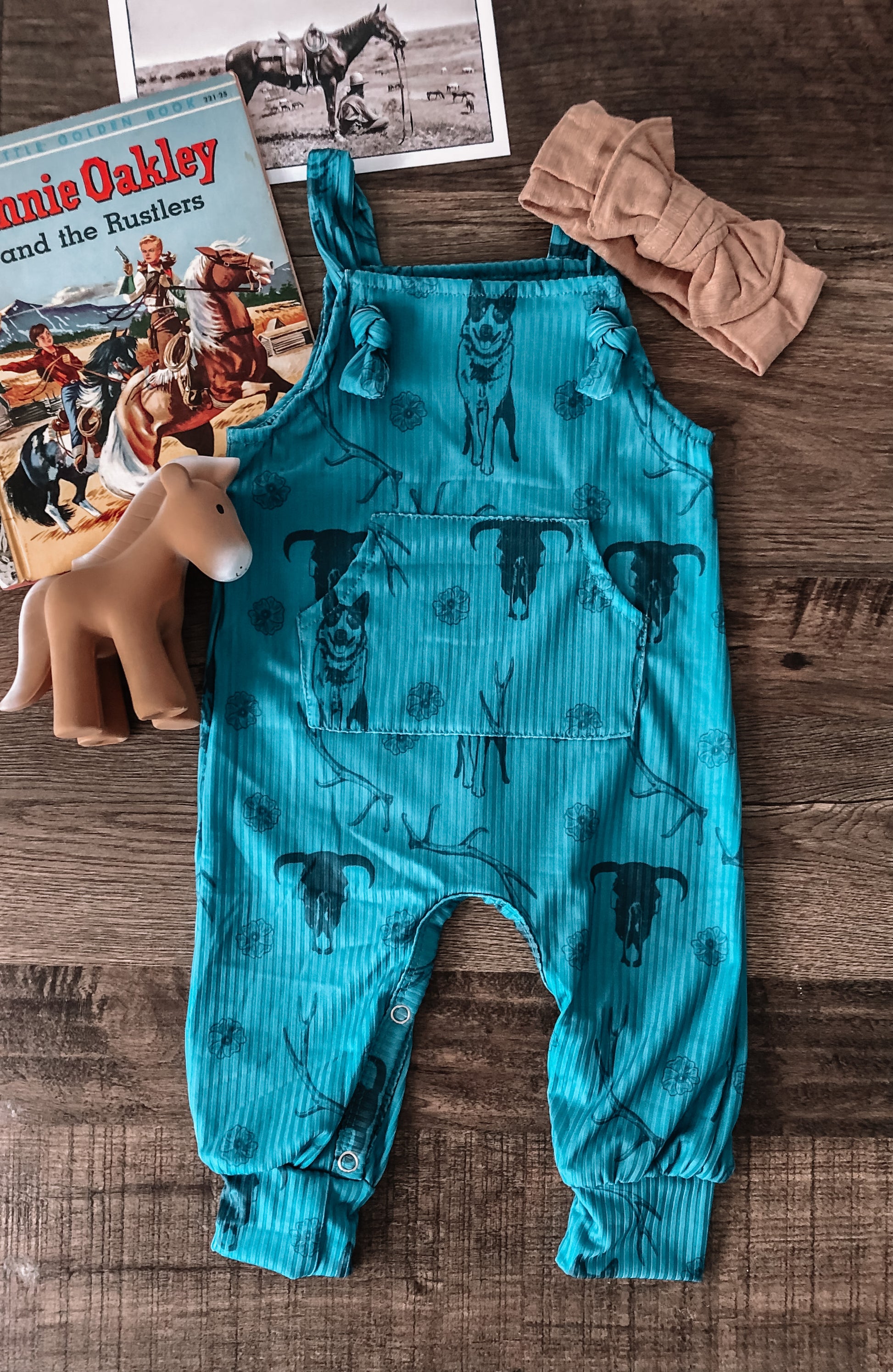 LWB exclusive cow dogs and deer sheds ribbed overall romper.