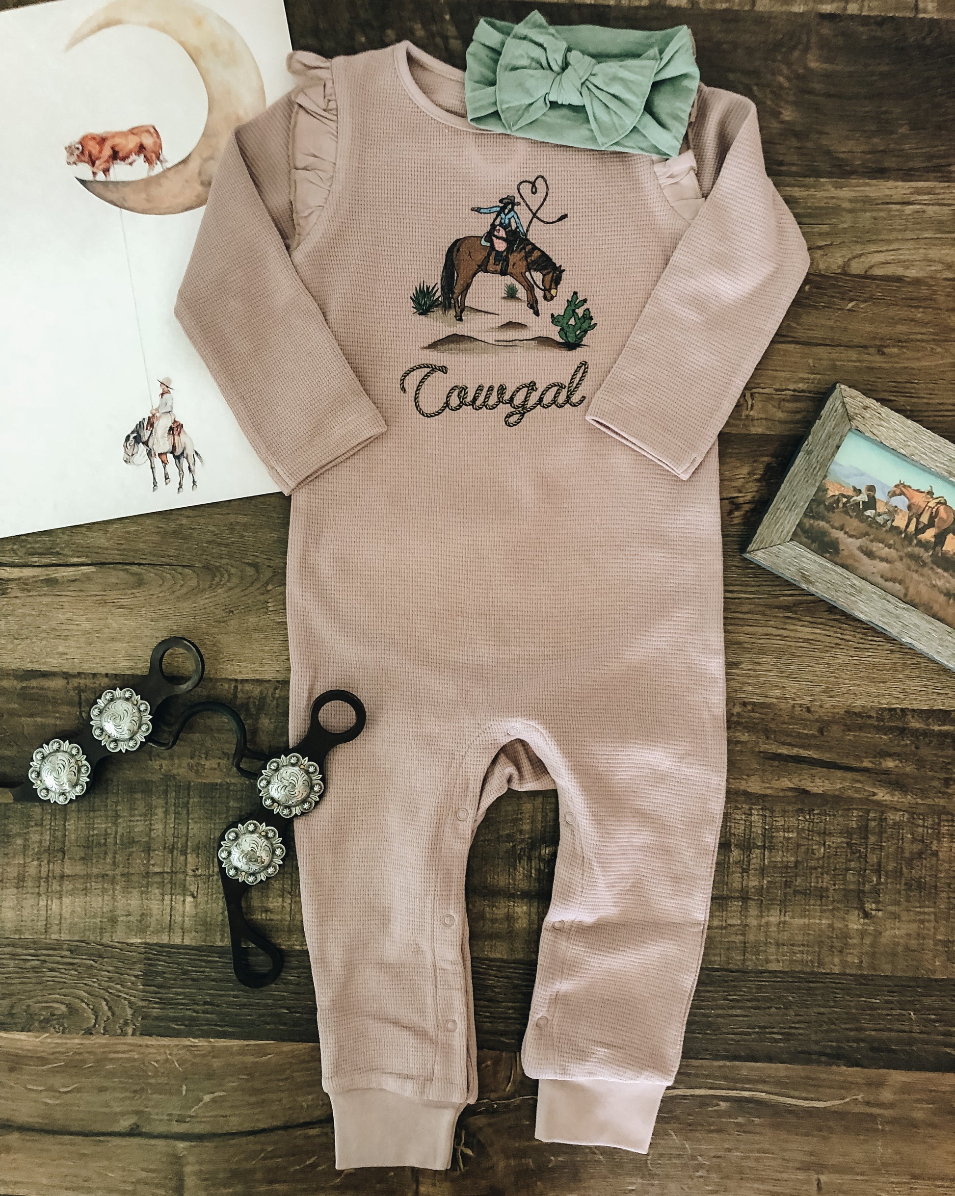LWB exclusive Cowgal design printed on a ruffle waffle romper.