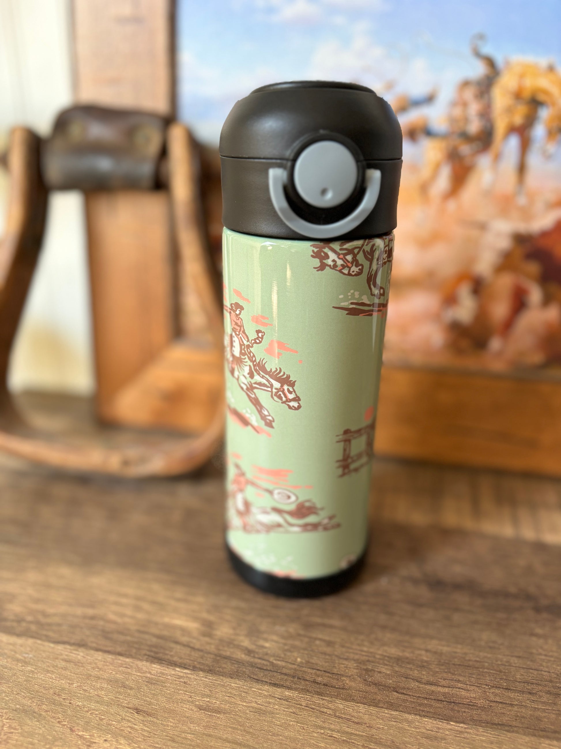 Green and pink cowgirl design printed on a stainless steel kids cup with built in straw.