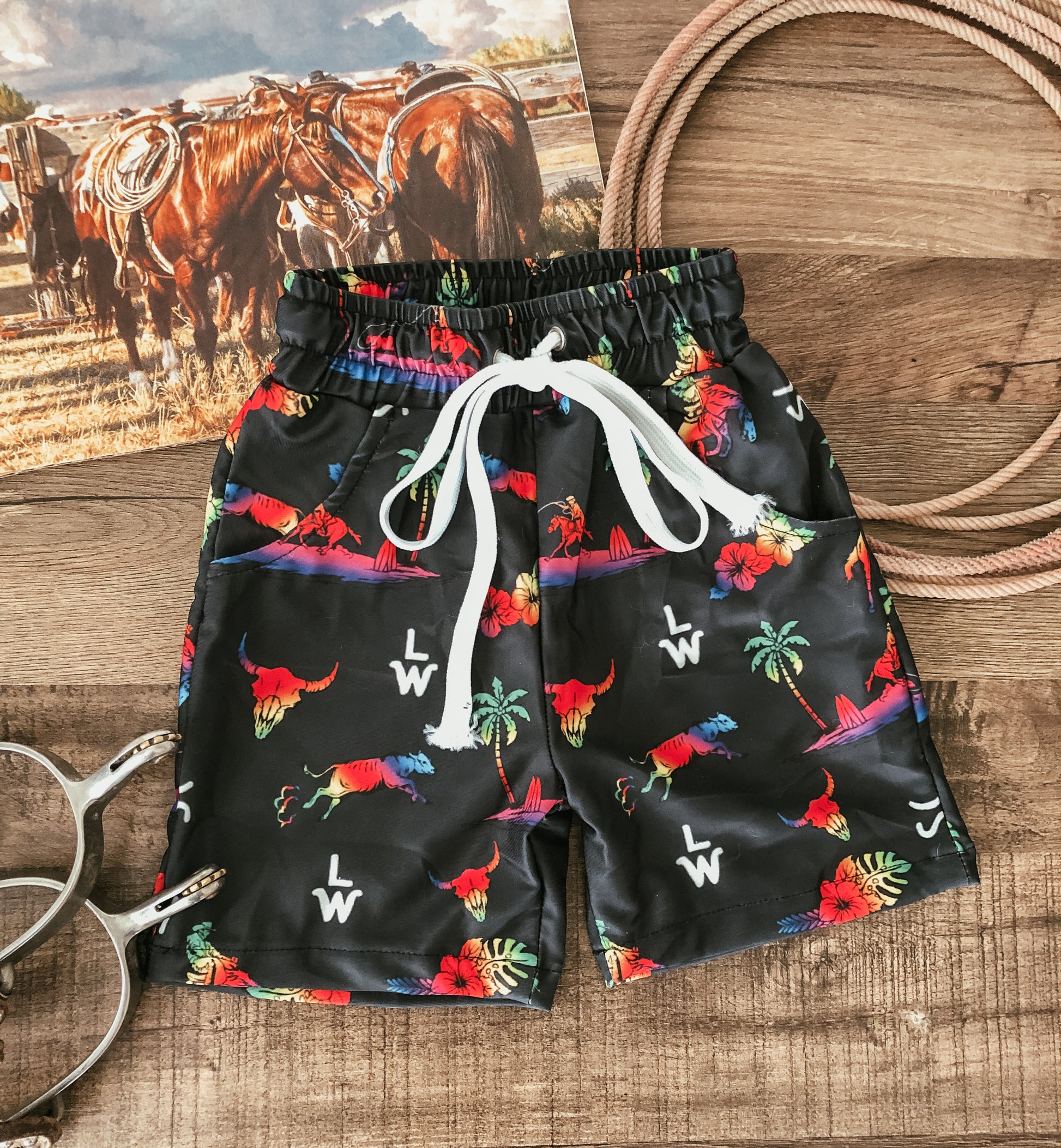 LWB exclusive Tropical Cowboy printed swim trunks. These were inspired by *name brand* board shorts. This adorable print has a cowboy roping a calf on the beach, a bucking horse, bull skulls, brands, and some hibiscus floral.